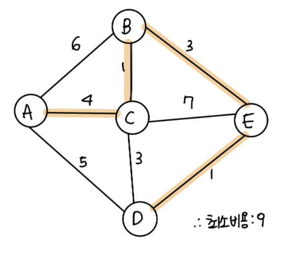 정점은 총 5개로 간선이 4(5-1)개가 되면 완성이 되는 것이다.